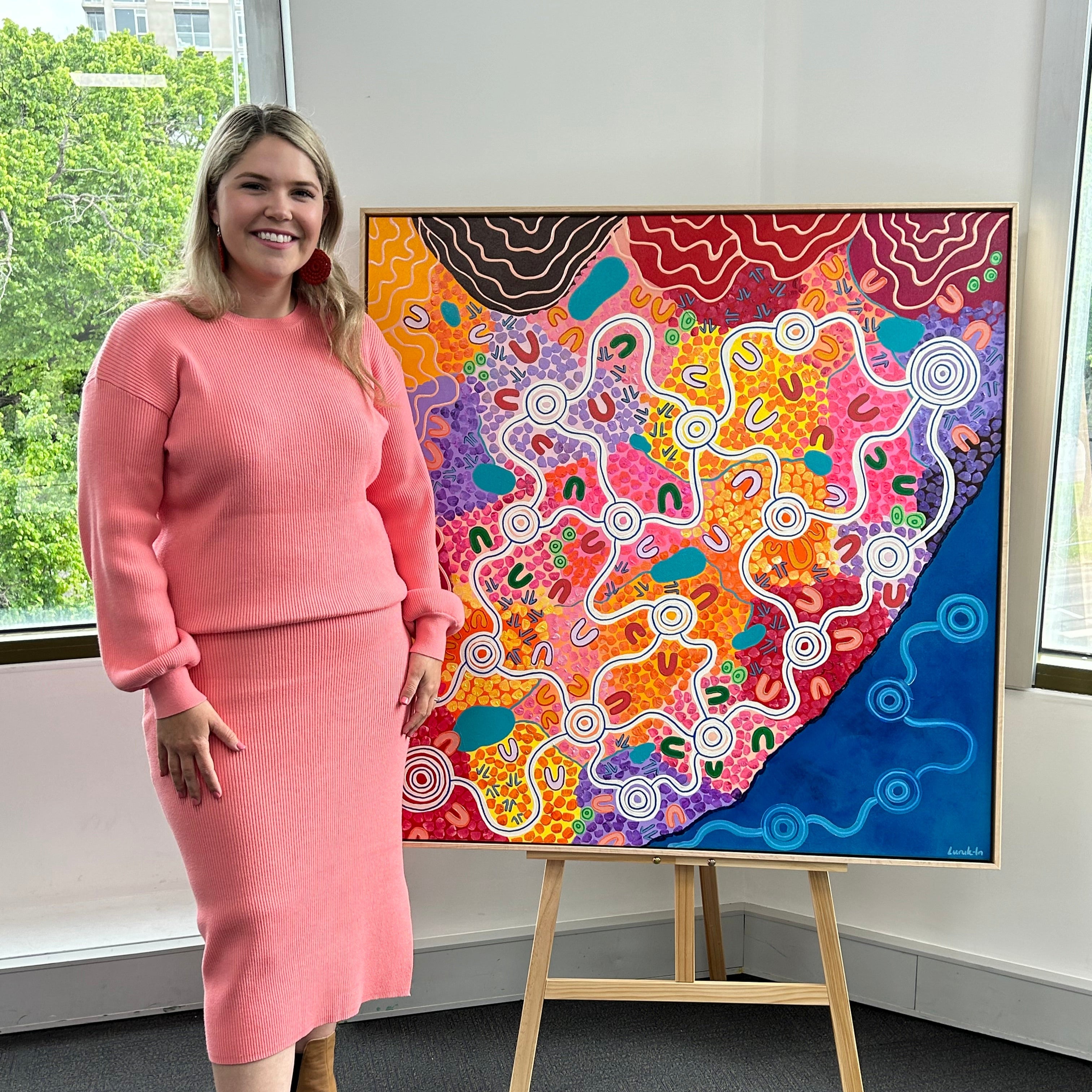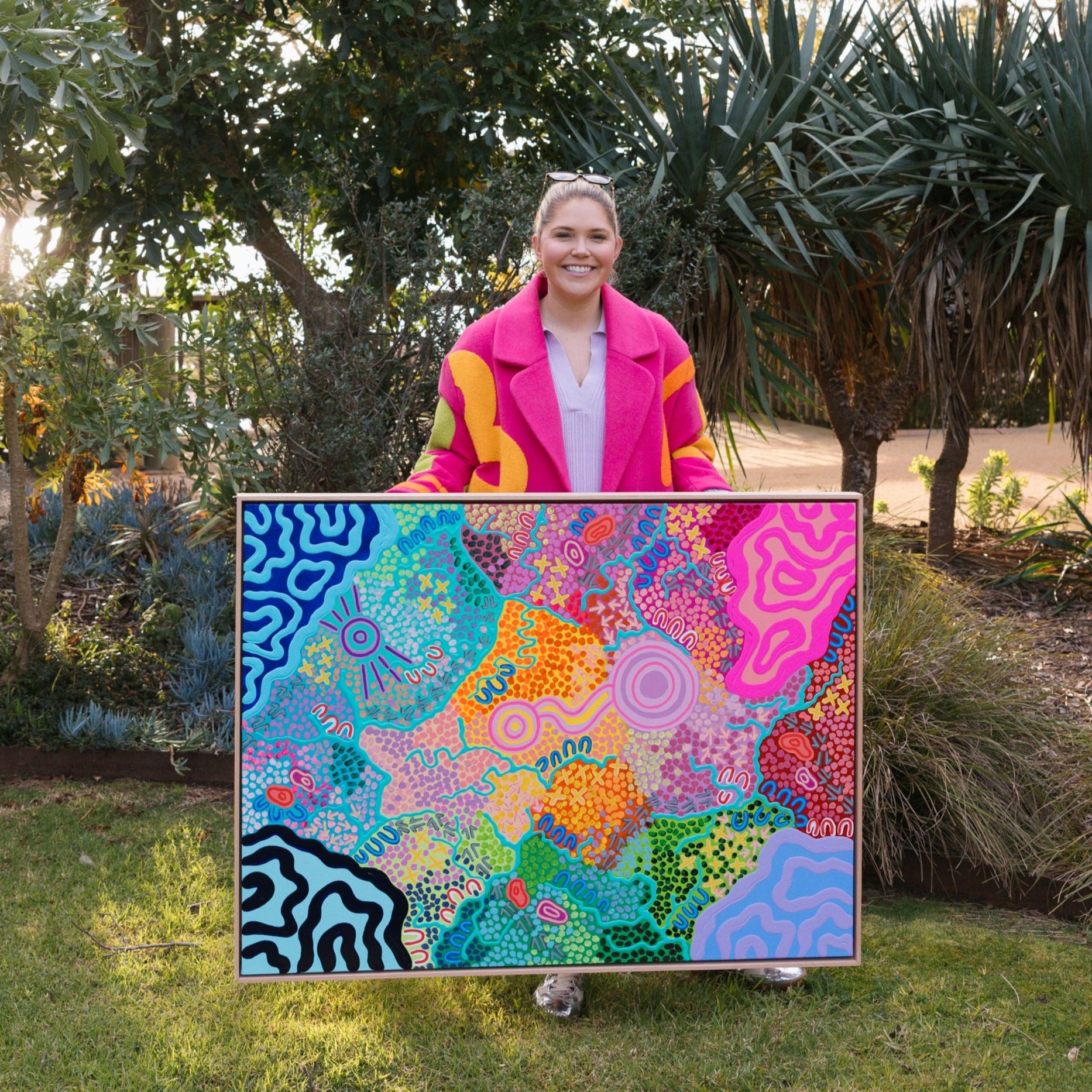 As an emerging contemporary Aboriginal artist, Aimee’s vibrant approach blends bright colours and textures with her strong cultural and ancestral identity. Her intricate, eye-catching artworks on canvas explore modern society through the lens of the world’s oldest living culture. She draws her greatest inspiration from Country its waterways, mountains, sand, soil, and shells - and channels this into her art to keep the sacred tradition of Storytelling alive.