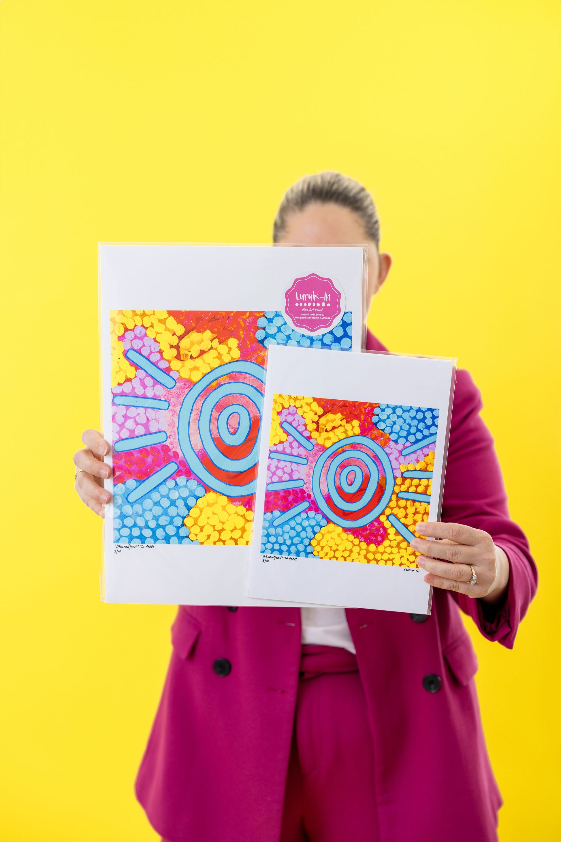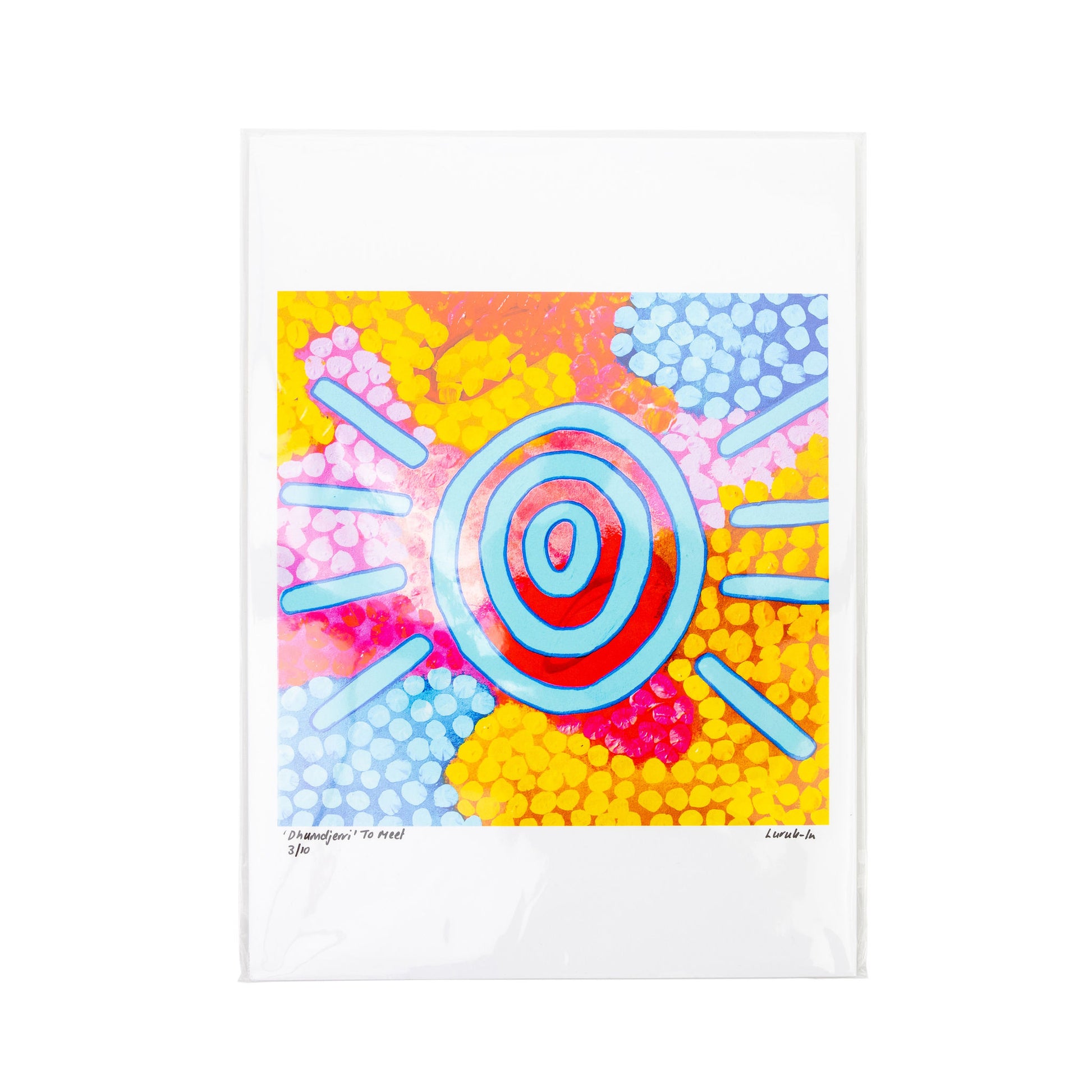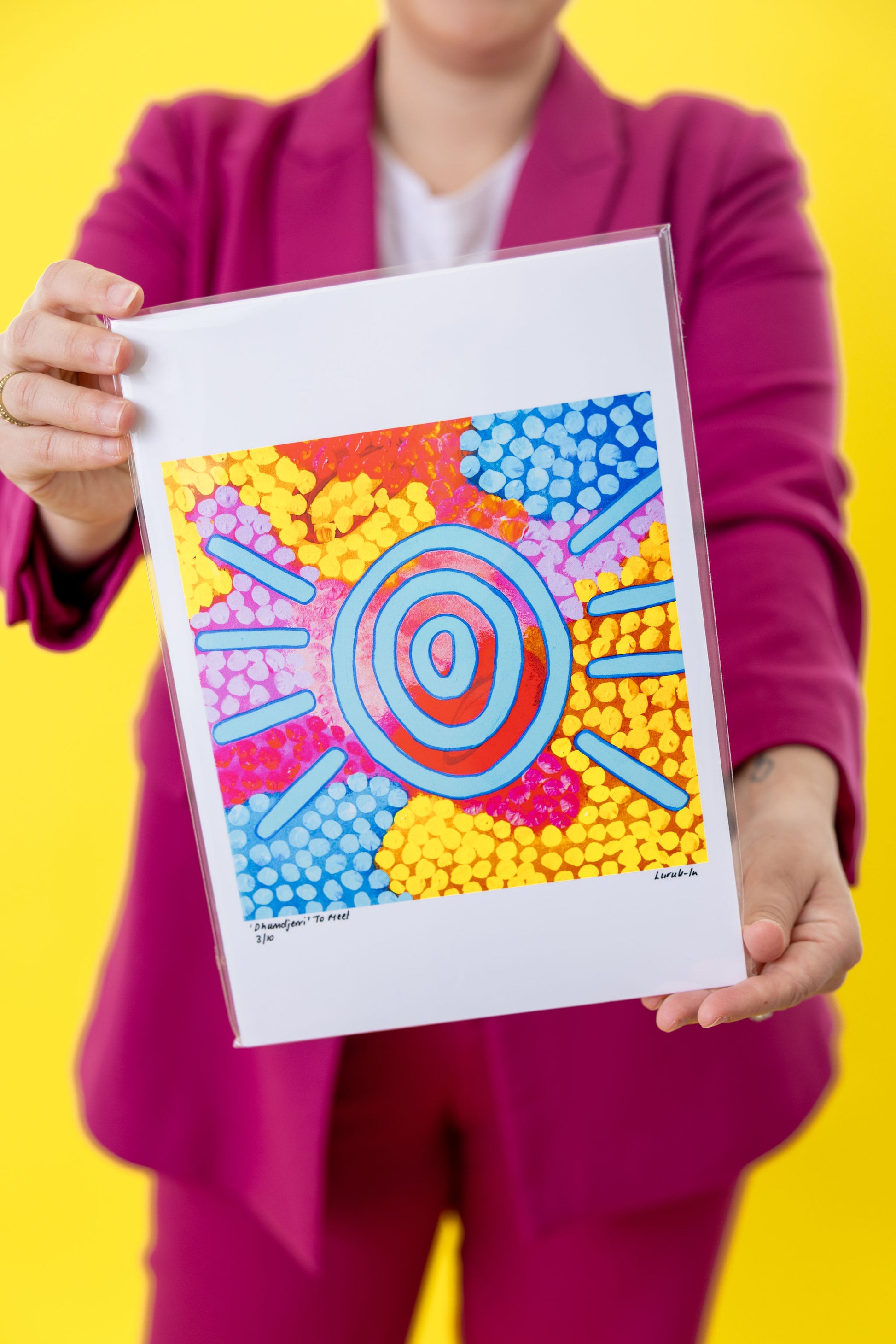 Dhumdjerri 'To Meet' celebrates the significance of meeting places in Aboriginal and Torres Strait culture as spaces of connection, storytelling and community. The vibrant colours reflect the energy and warmth of gatherings, where people come together to share knowledge, strengthen relationships, and pass down traditions.