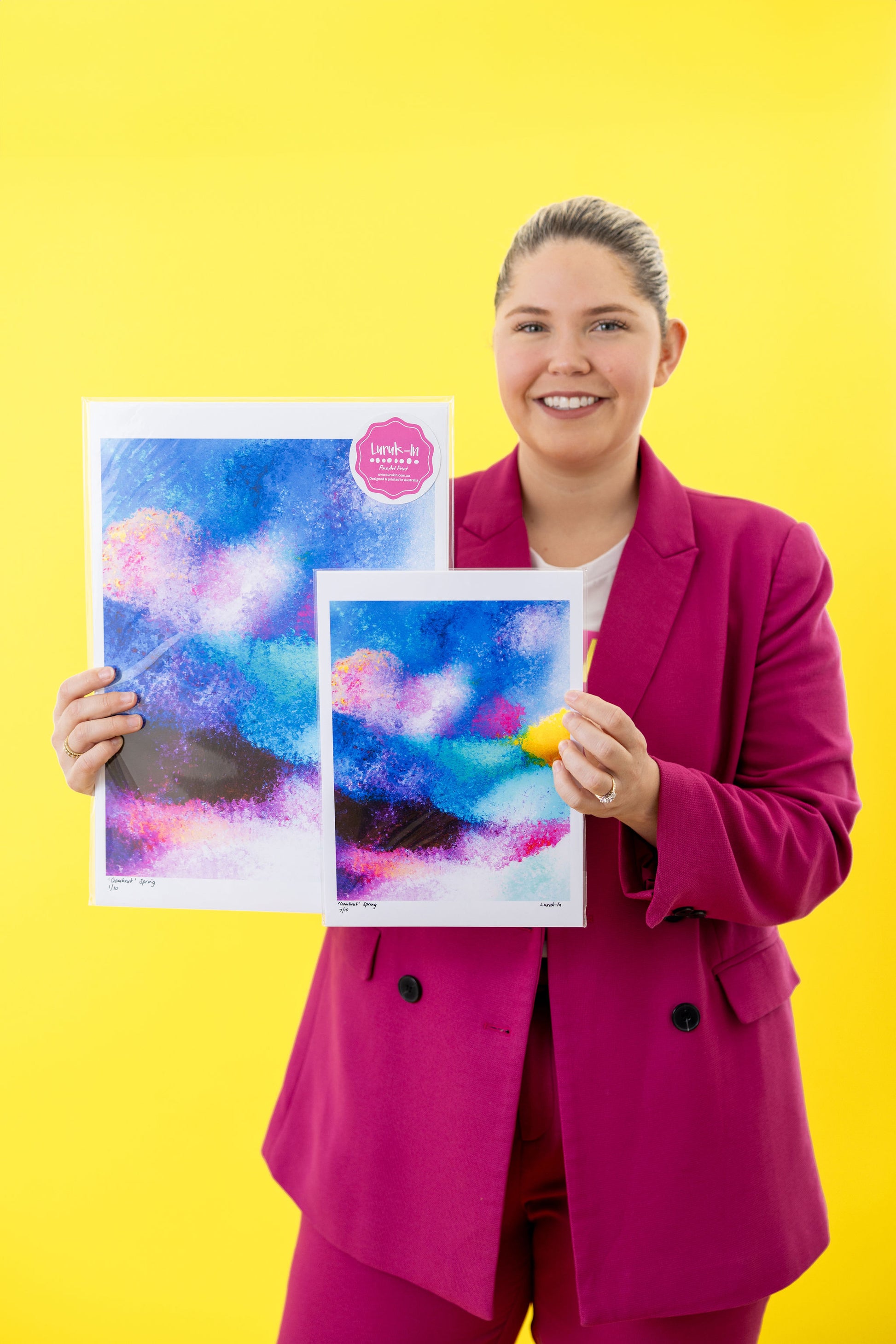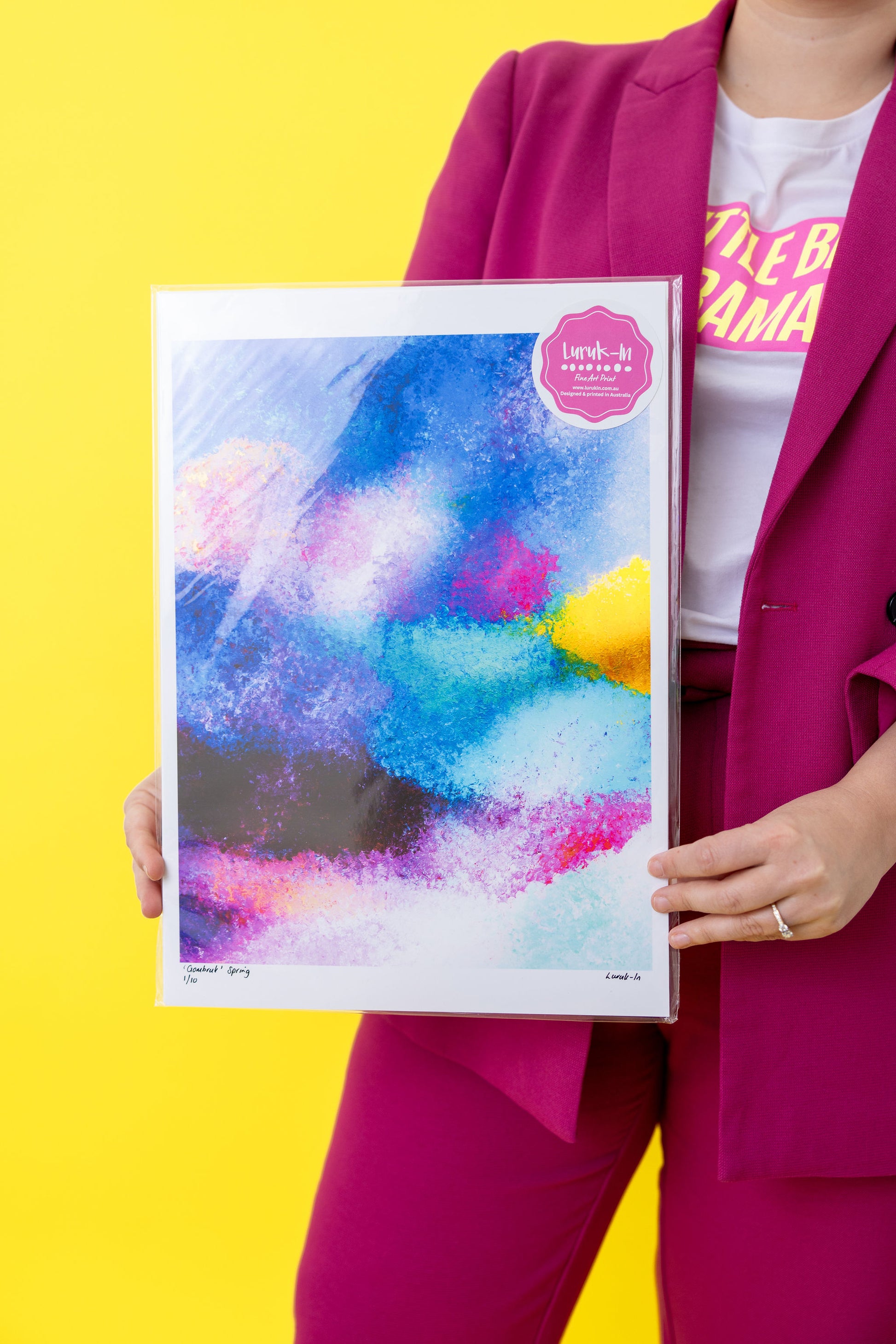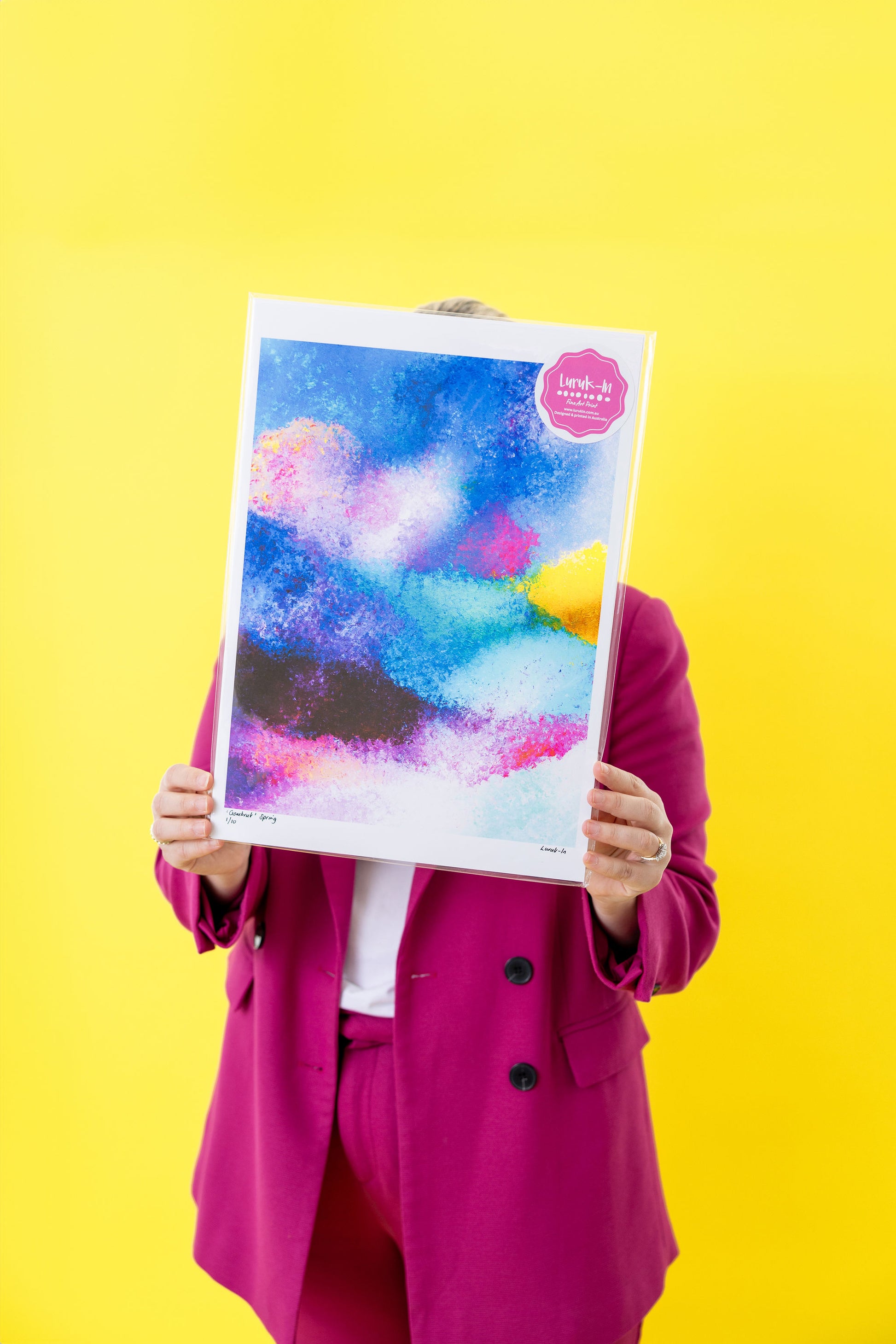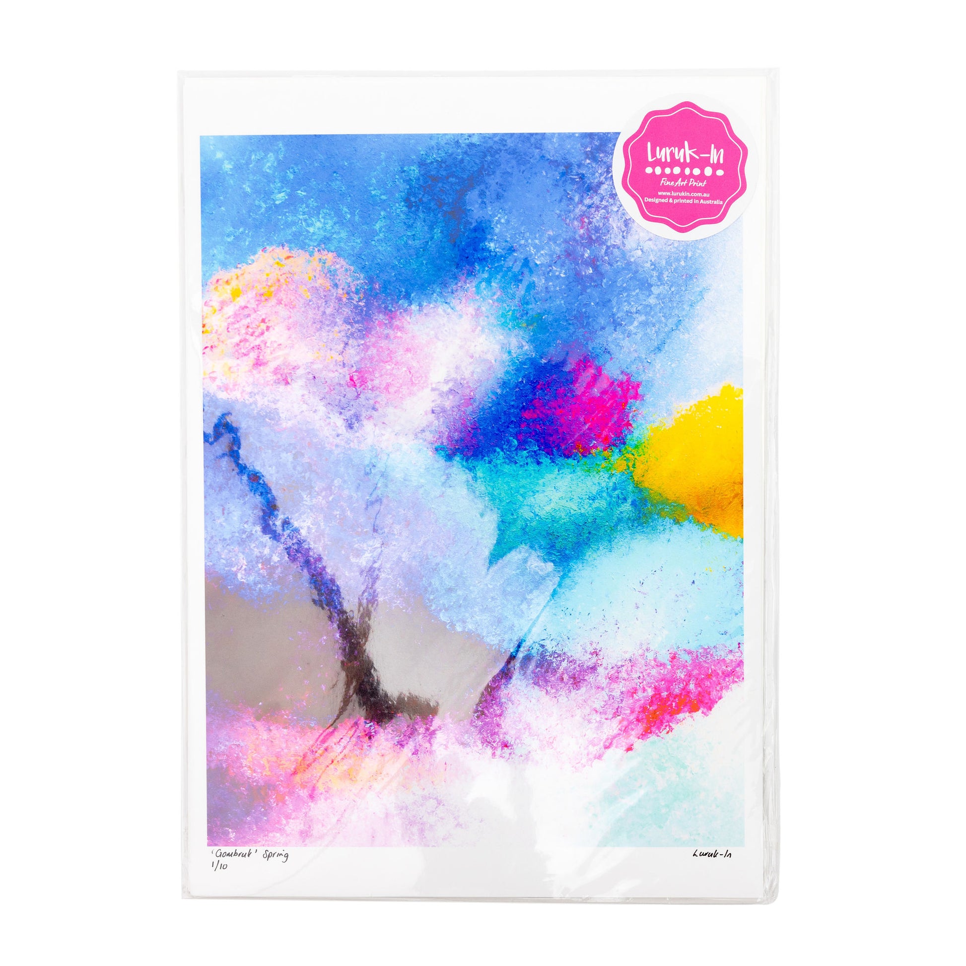 Gombruk 'Spring' is a celebration of new beginnings and the vibrant energy of Country during September - November. The rich blues represent flowing waterways nourished by the season, while the warm pinks, purples and yellow symbolise the blooming flora and the warmth of the sun over Country. This artwork reflects the spirit of spring as a time of abundance, renewal, and connection.