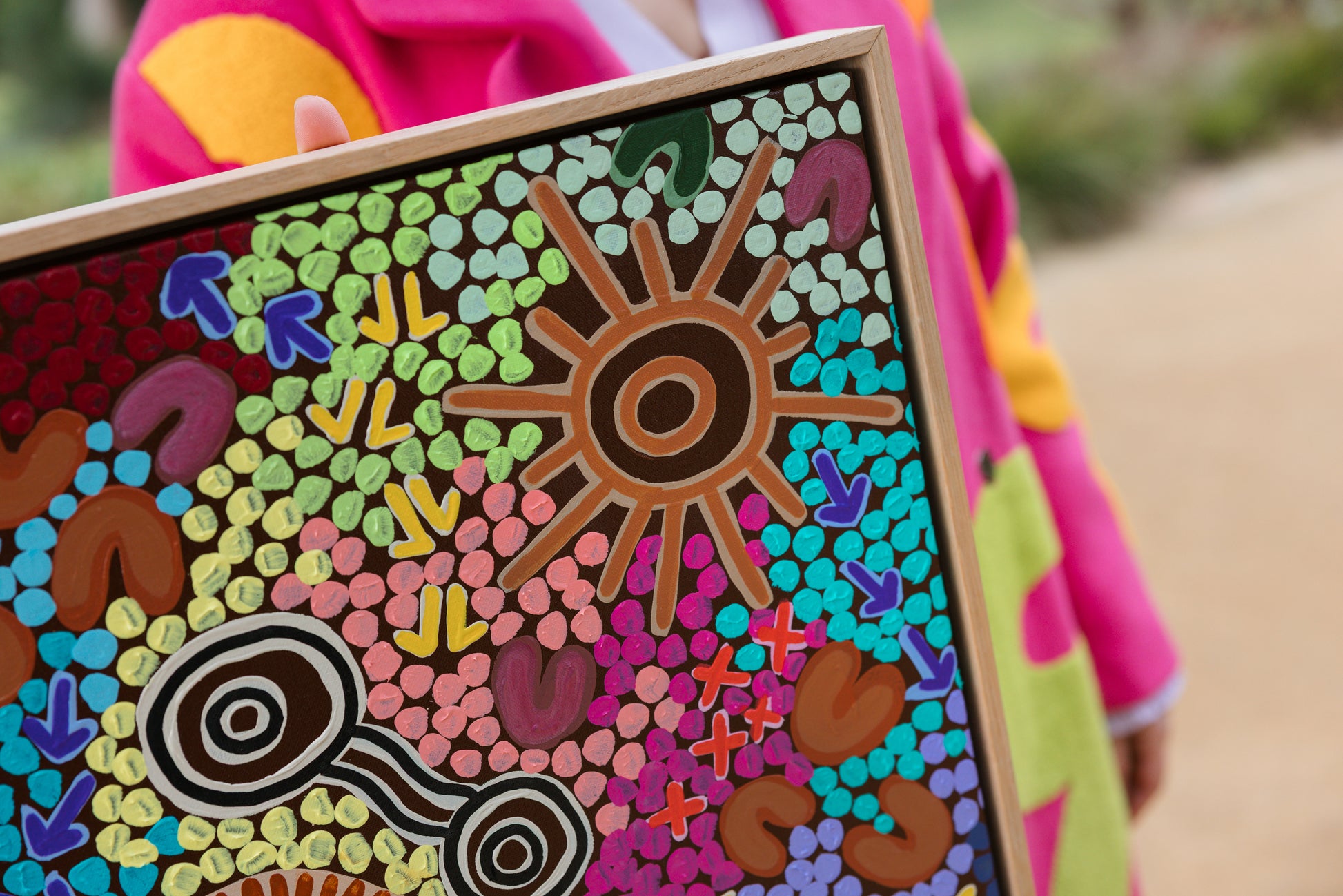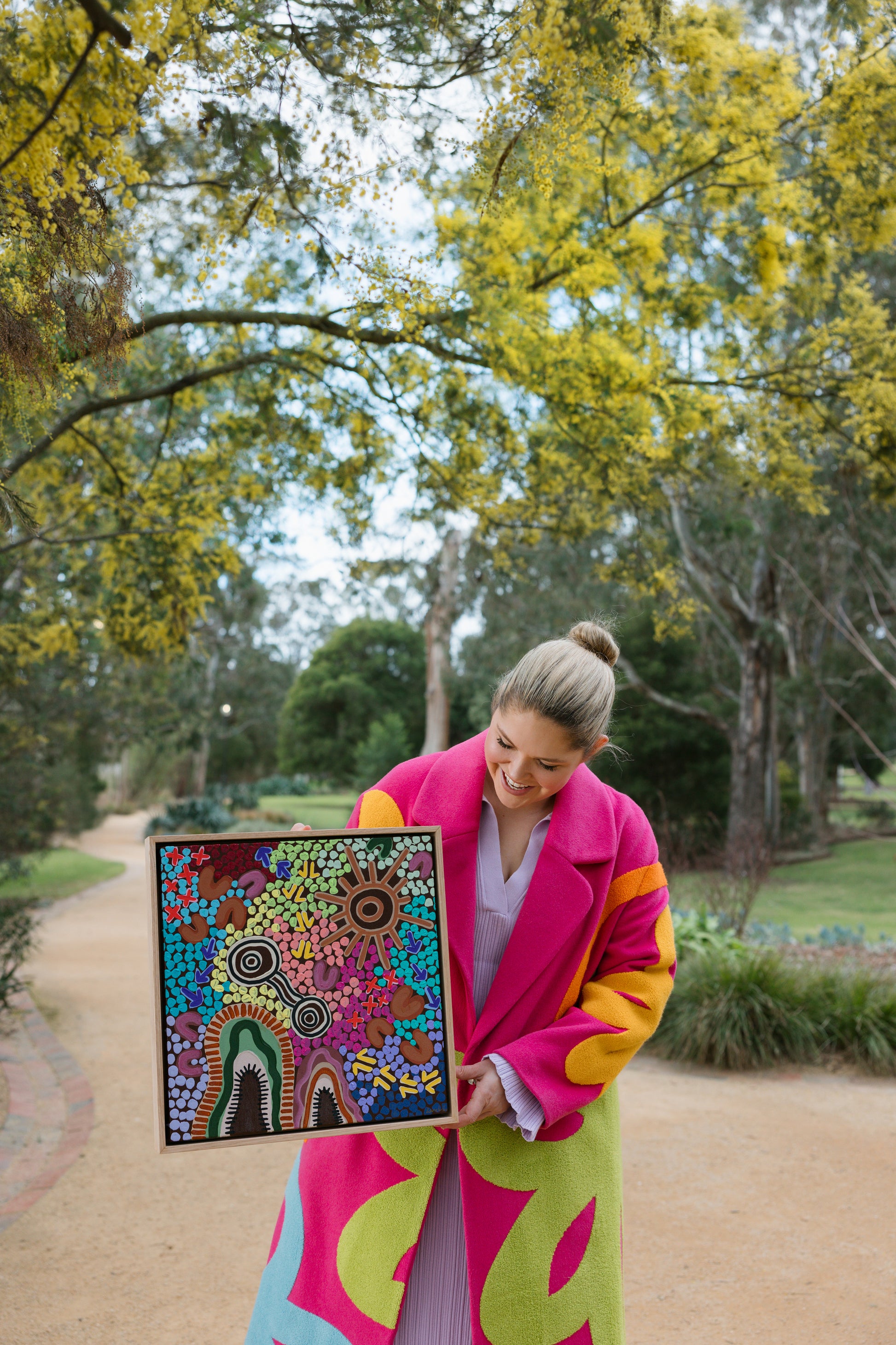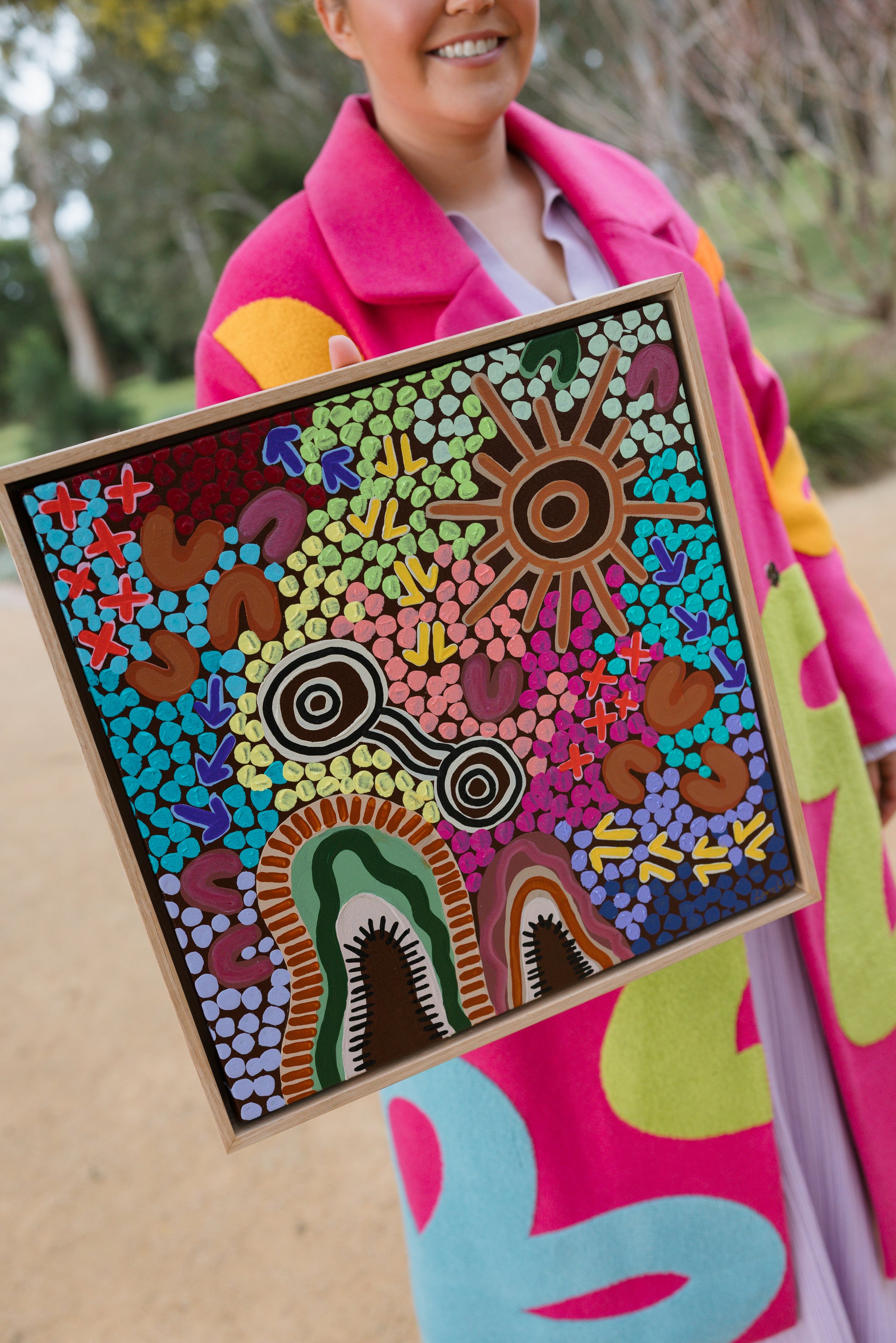 This piece is a tribute to the strength and spirit of Country, where stories rest in the folds of the hills. Bold earthy tones and layered textures reflect the resilience of the land, while the forms echo the quiet power of Victoria’s high country - a place of memory, culture, and belonging. It reminds us of how Country continues to hold, protect, and guide us forward.