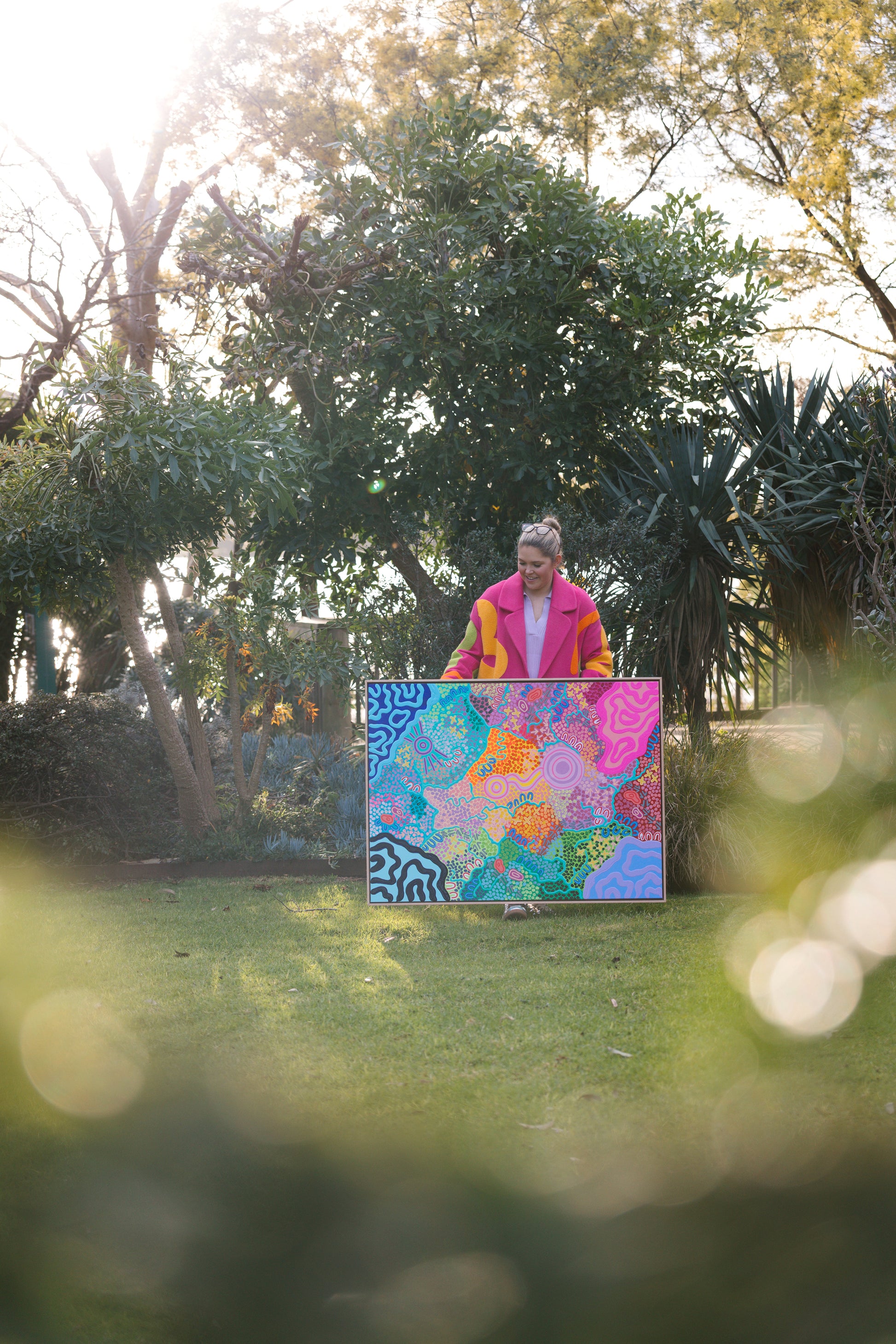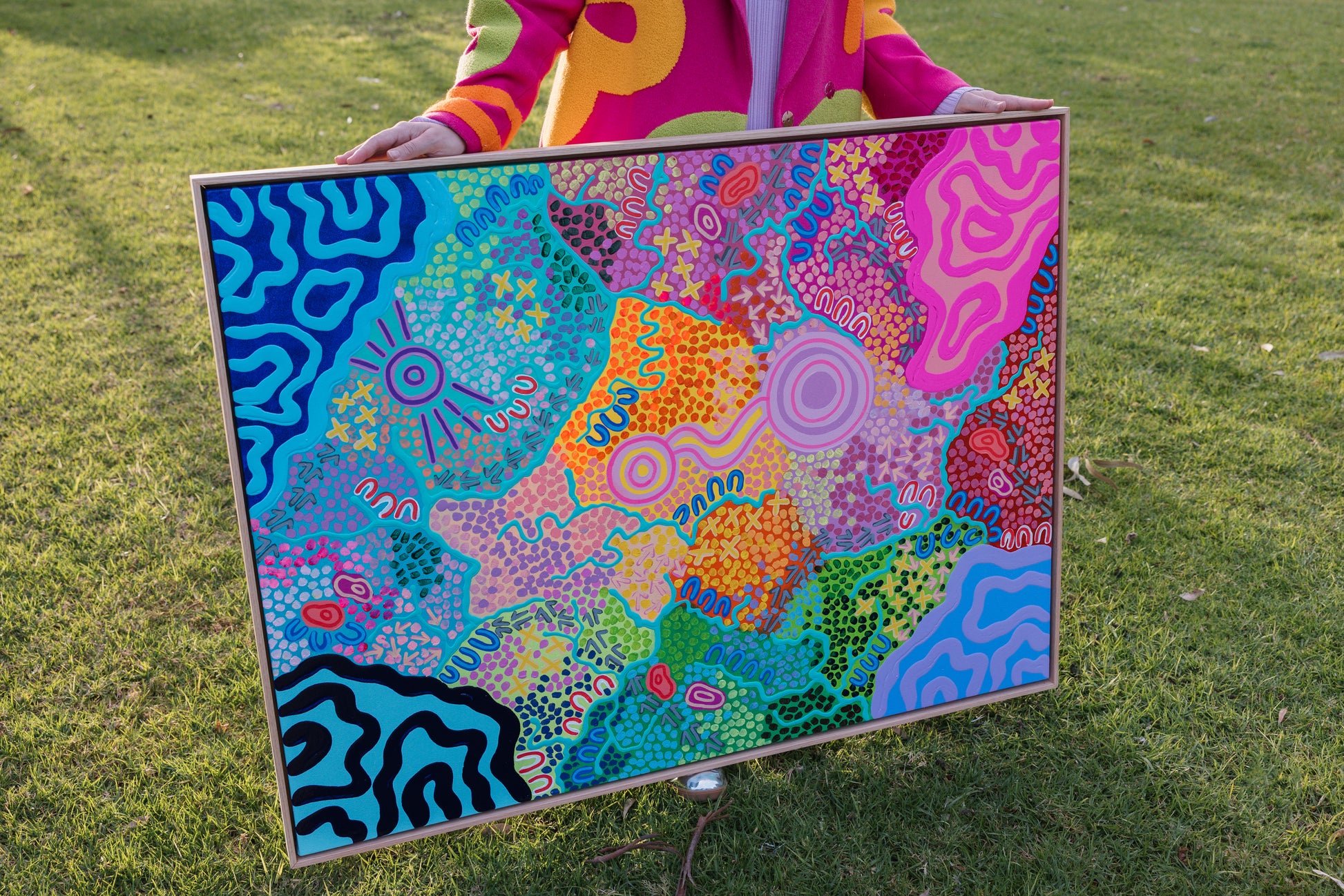 This artwork honours the Country that holds and shapes us. The rivers and mountains speak of deep connection, while the meeting places reflect the importance of gathering, sharing and keeping story alive. Through its layers of colour and texture, the piece captures the spirit, strength and beauty of this land - this Country.