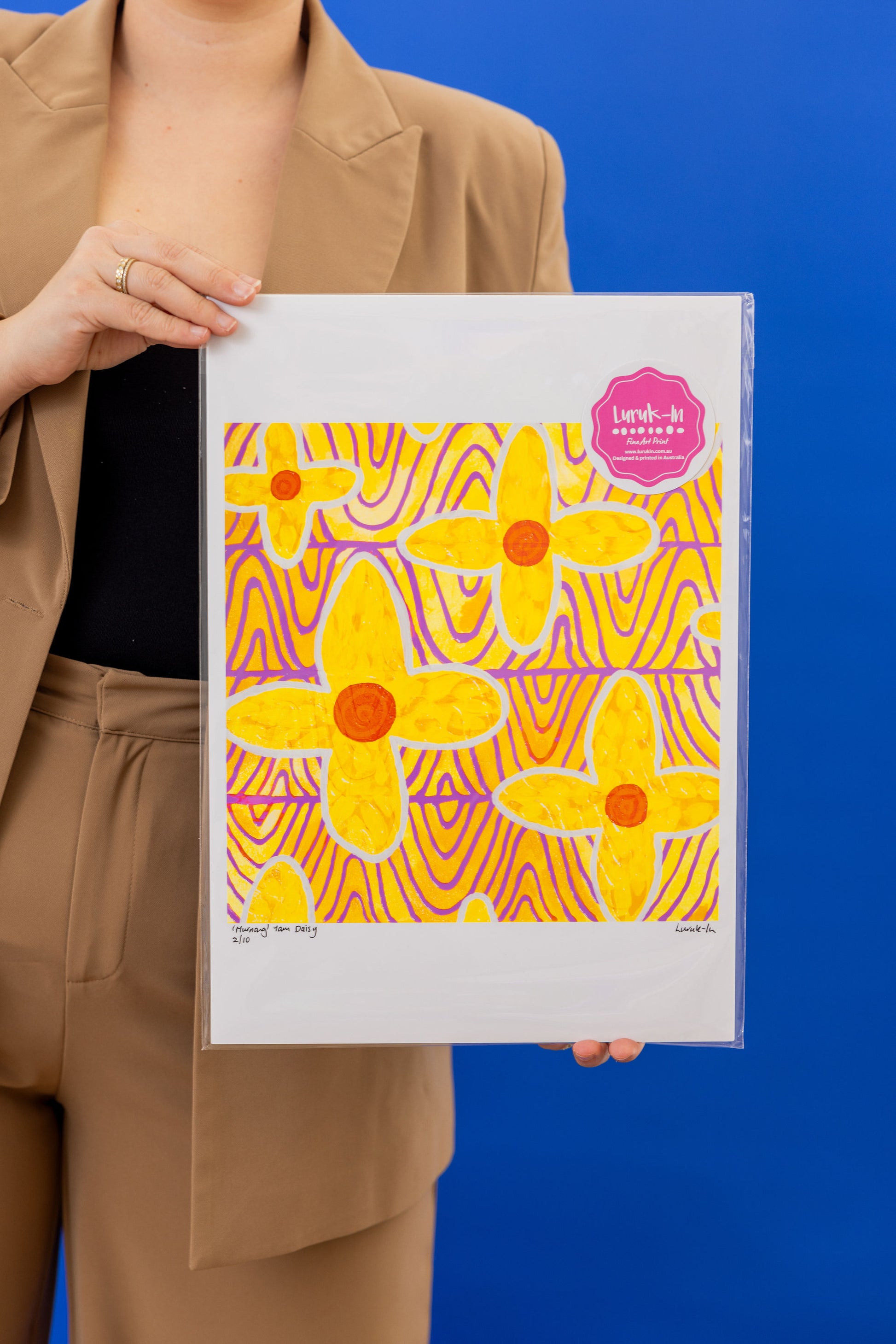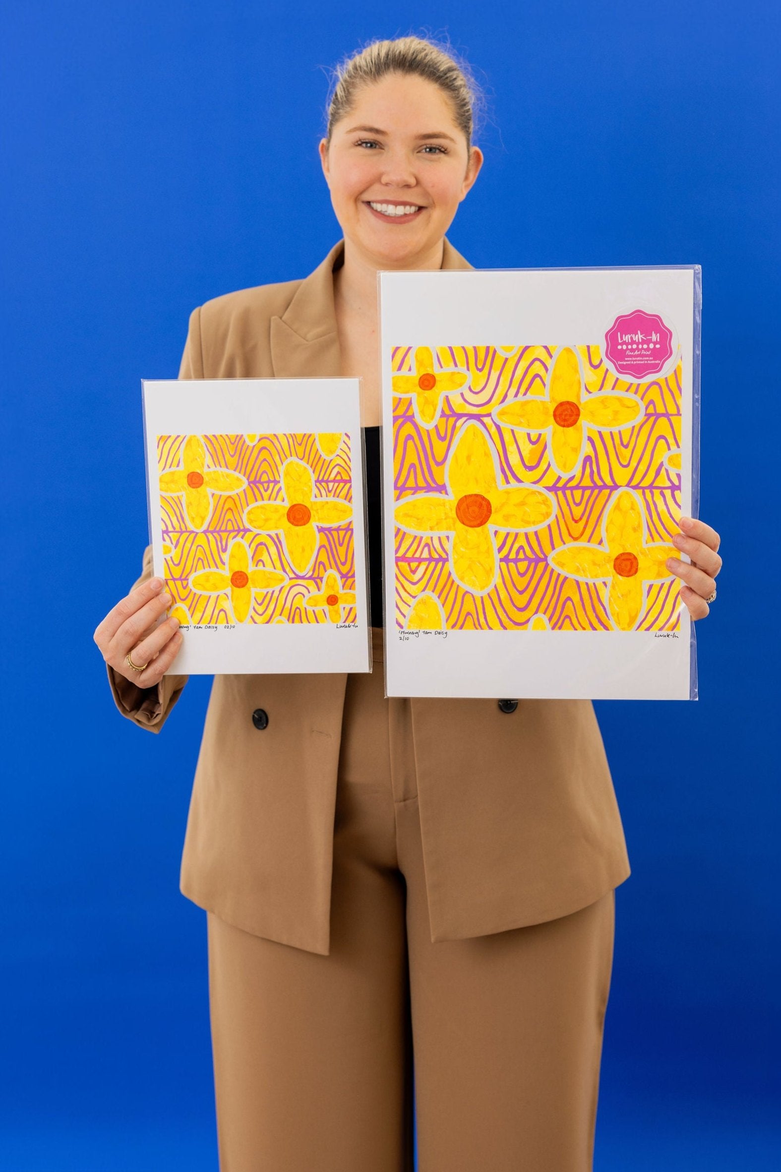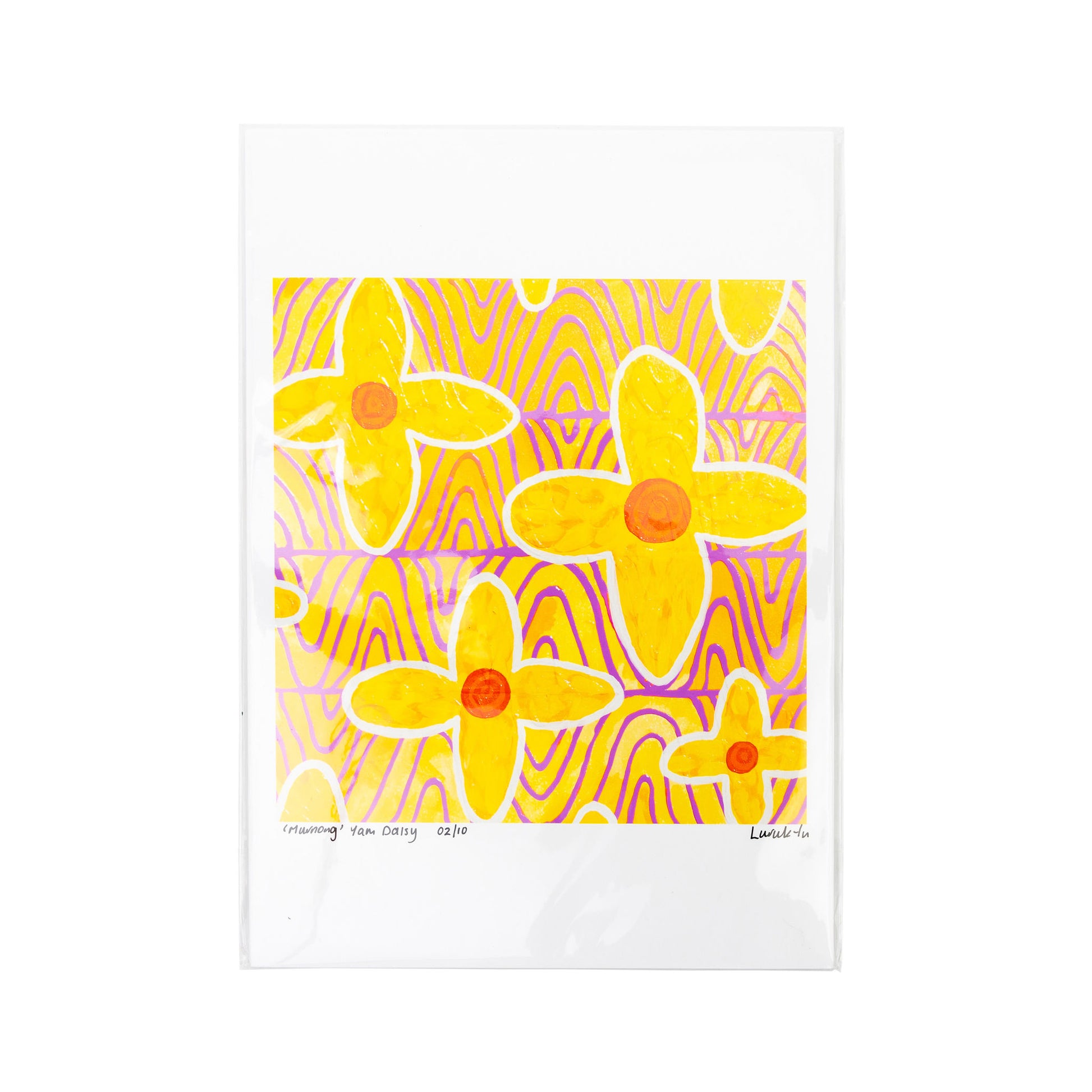Murnong 'Yam Daisy' is a vibrant artwork that celebrates the significance of the Murnong plant to the people of the Kulin Nations. The bright yellows and organic forms reflect the beauty and abundance of this native plant, which was a vital food source and symbol of sustenance. This artwork honours the deep connection between our people, land, and the practices that sustained our communities for generations, inviting reflection on the importance of caring for Country.
