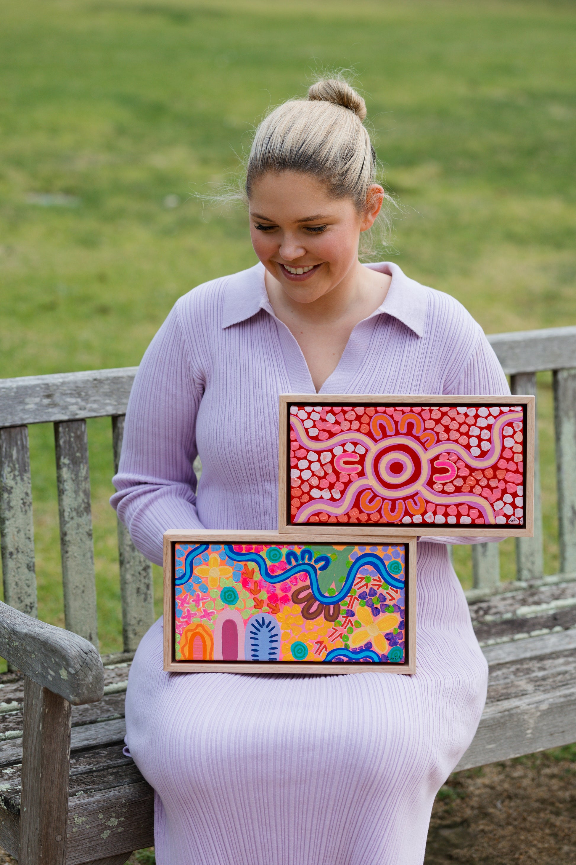 This artwork reflects the energy and togetherness of a traditional gathering. The central meeting place represents community, while the flowing lines and vibrant colours echo song, dance, and movement across Country. A celebration of connection, culture, and shared spirit.