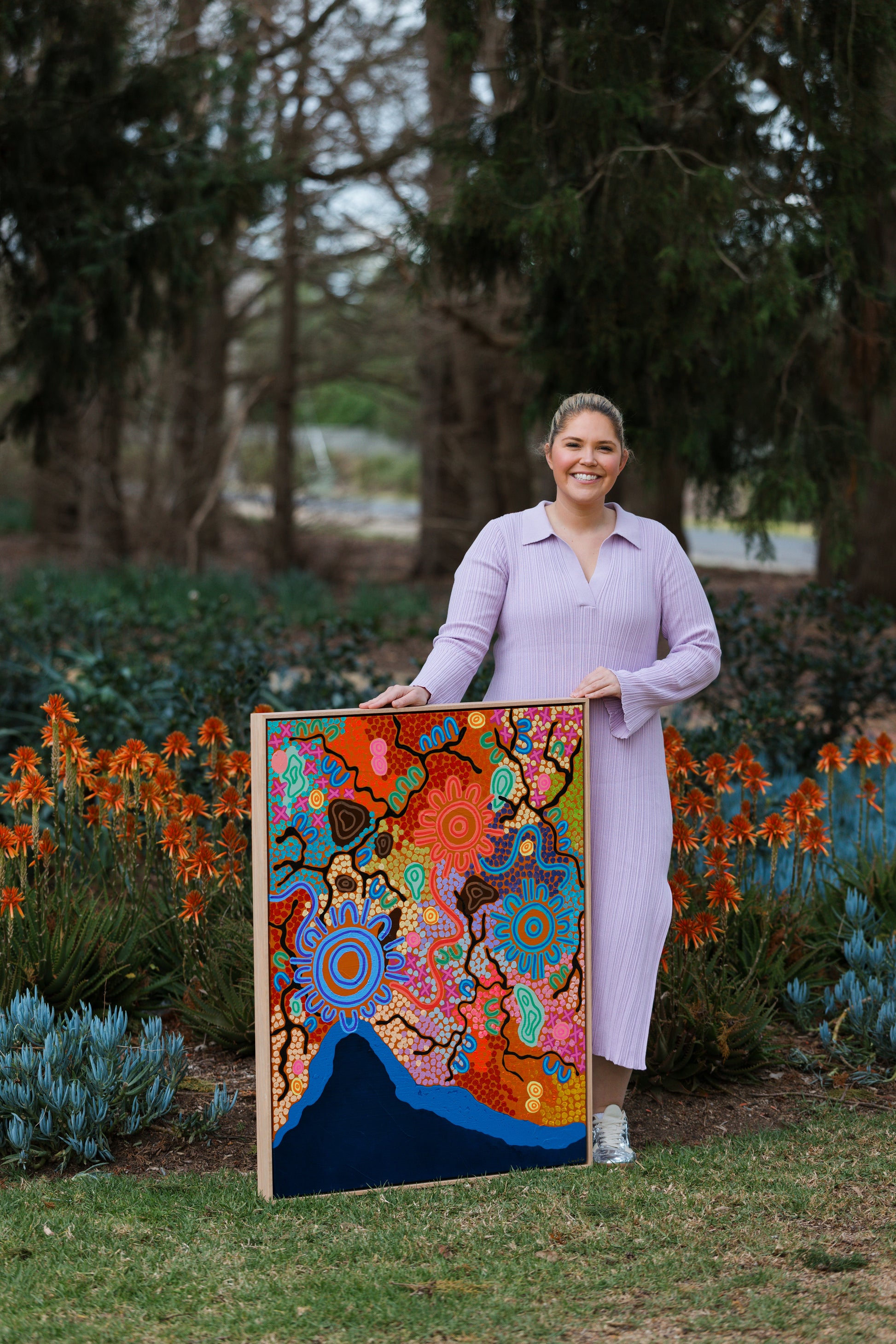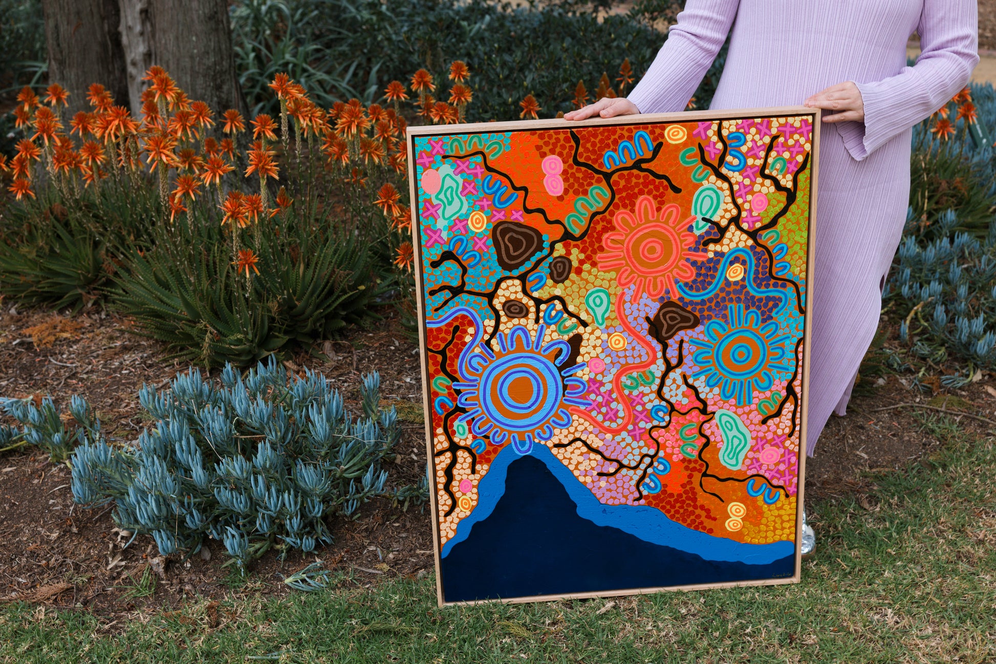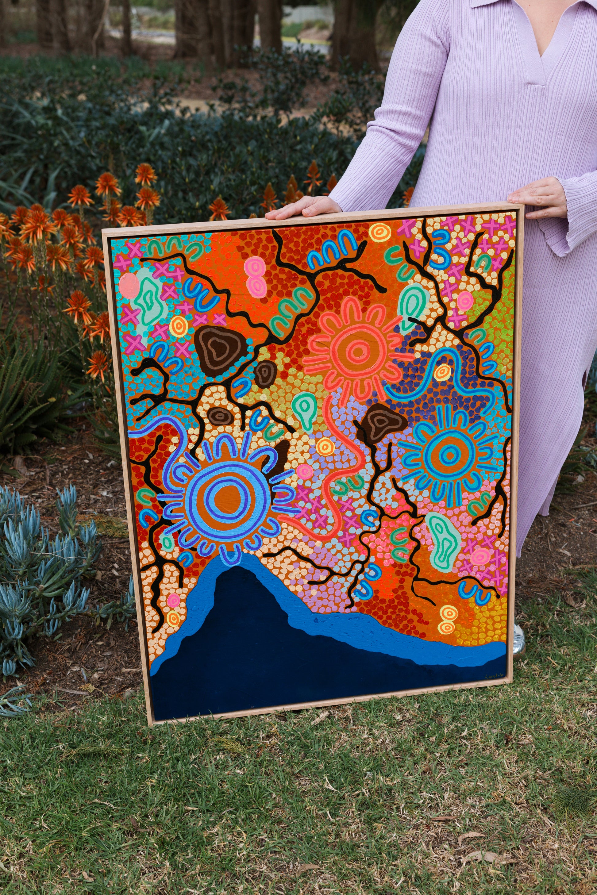 This artwork speaks to the sacred role of water as the lifeblood of Country. The deep blue represents a large body of water, holding strength and vitality, while pathways and meeting places show how people are drawn to gather along its edges. Water sustains the land, nourishes community, and carries stories that flow from generation to generation. This artwork is a reminder that to care for water is to care for Country itself.