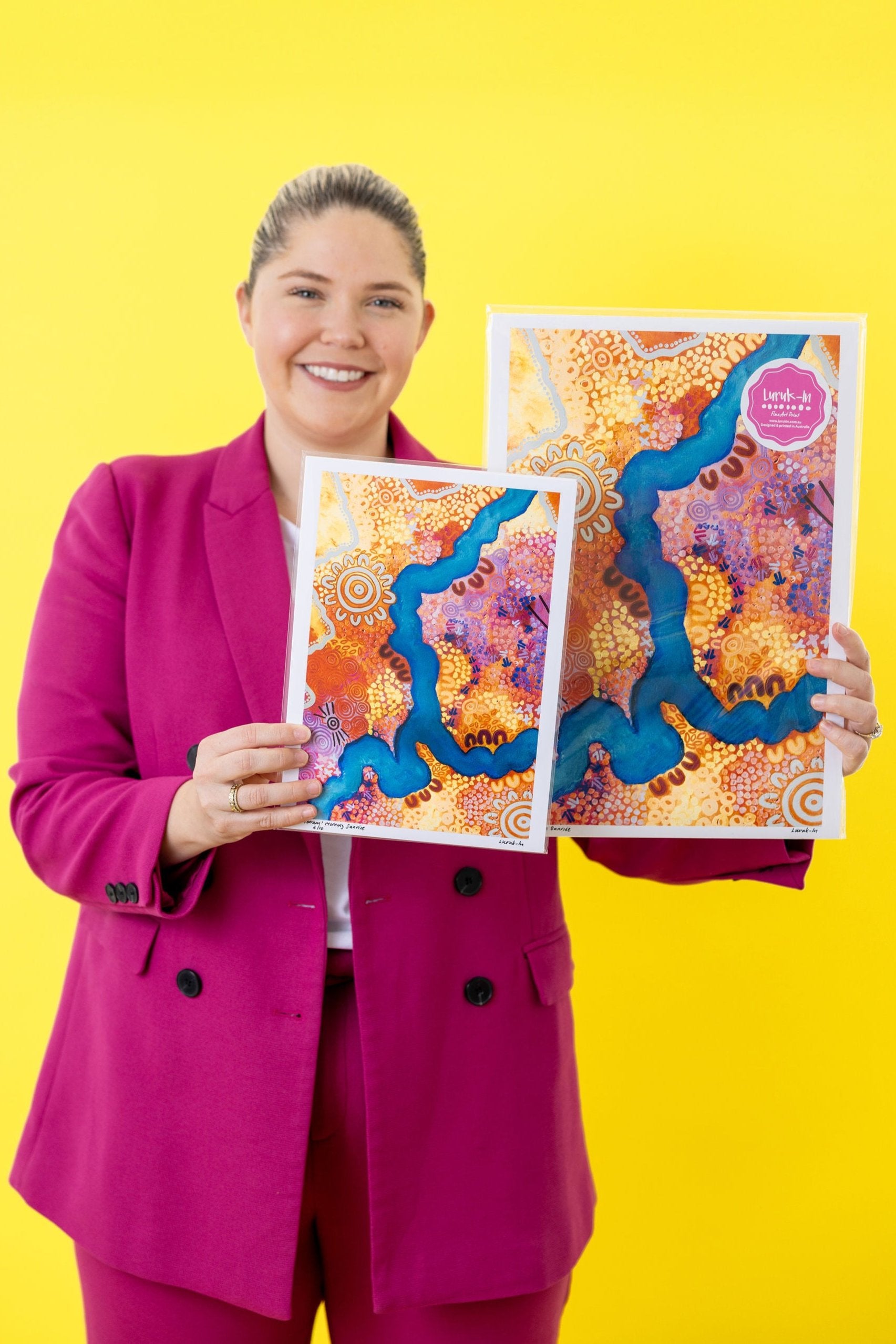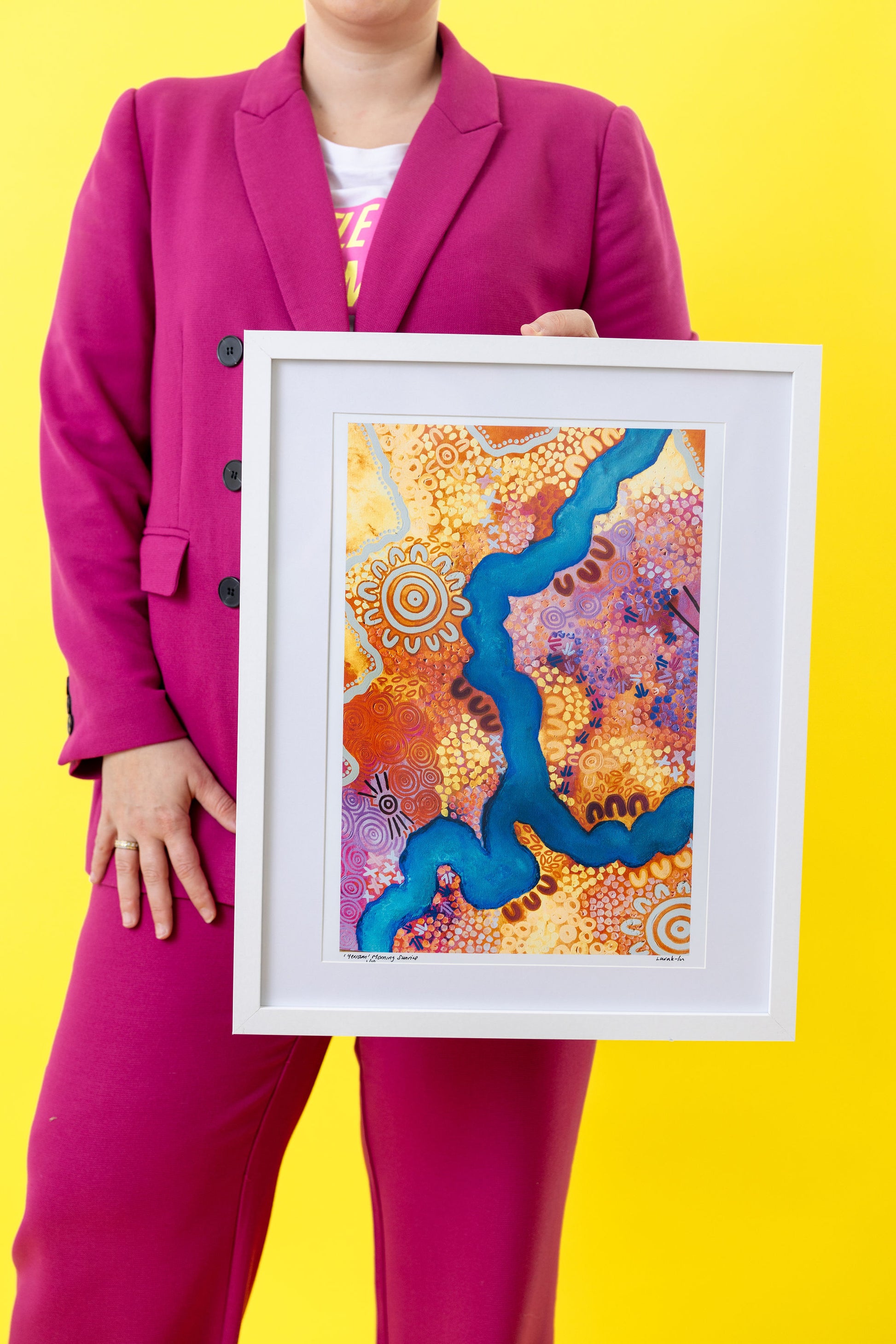 Yerram 'Morning Sunrise' captures the beauty and connection of Country as the first light of dawn graces across the landscape. The flowing river winds through the artwork, symbolising life and connection, while meeting places highlight the importance of gathering and community. The warm hues of orange, pink, and yellow reflect the soft glow of the sunrise over the land, bringing warmth and renewal.